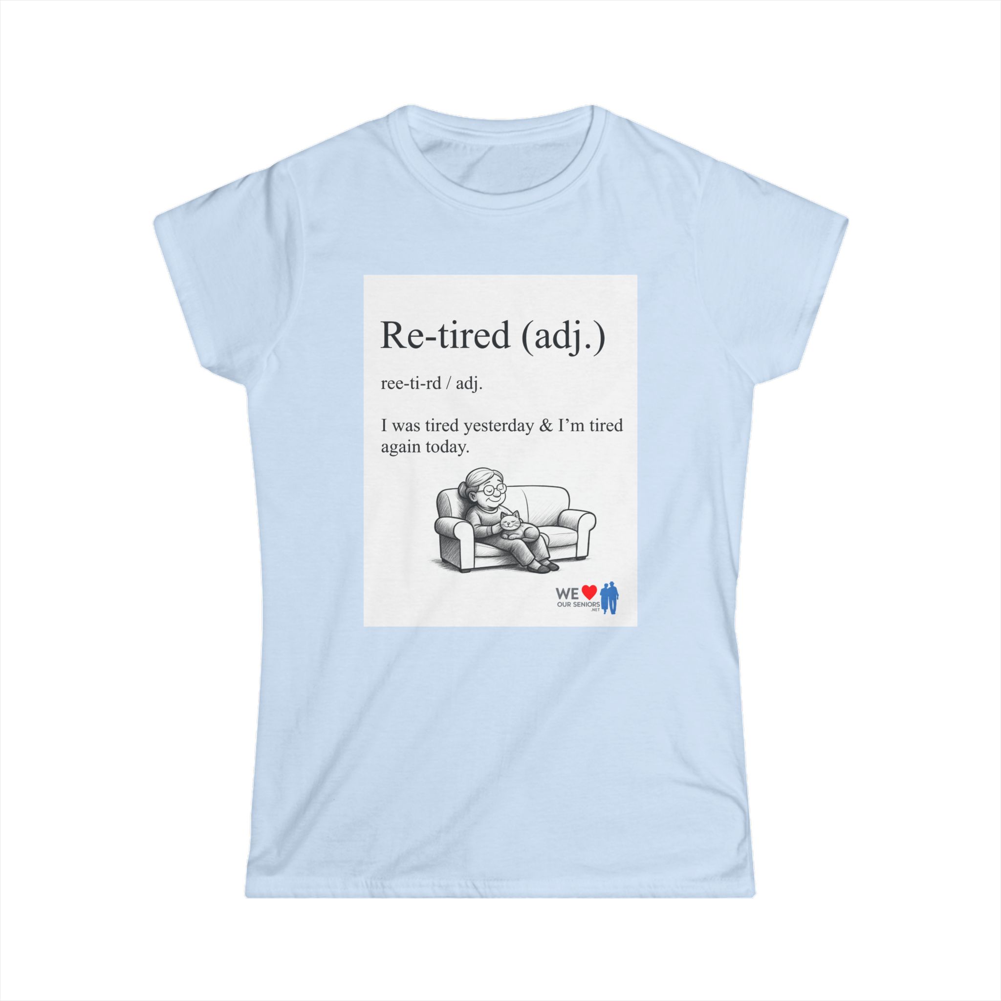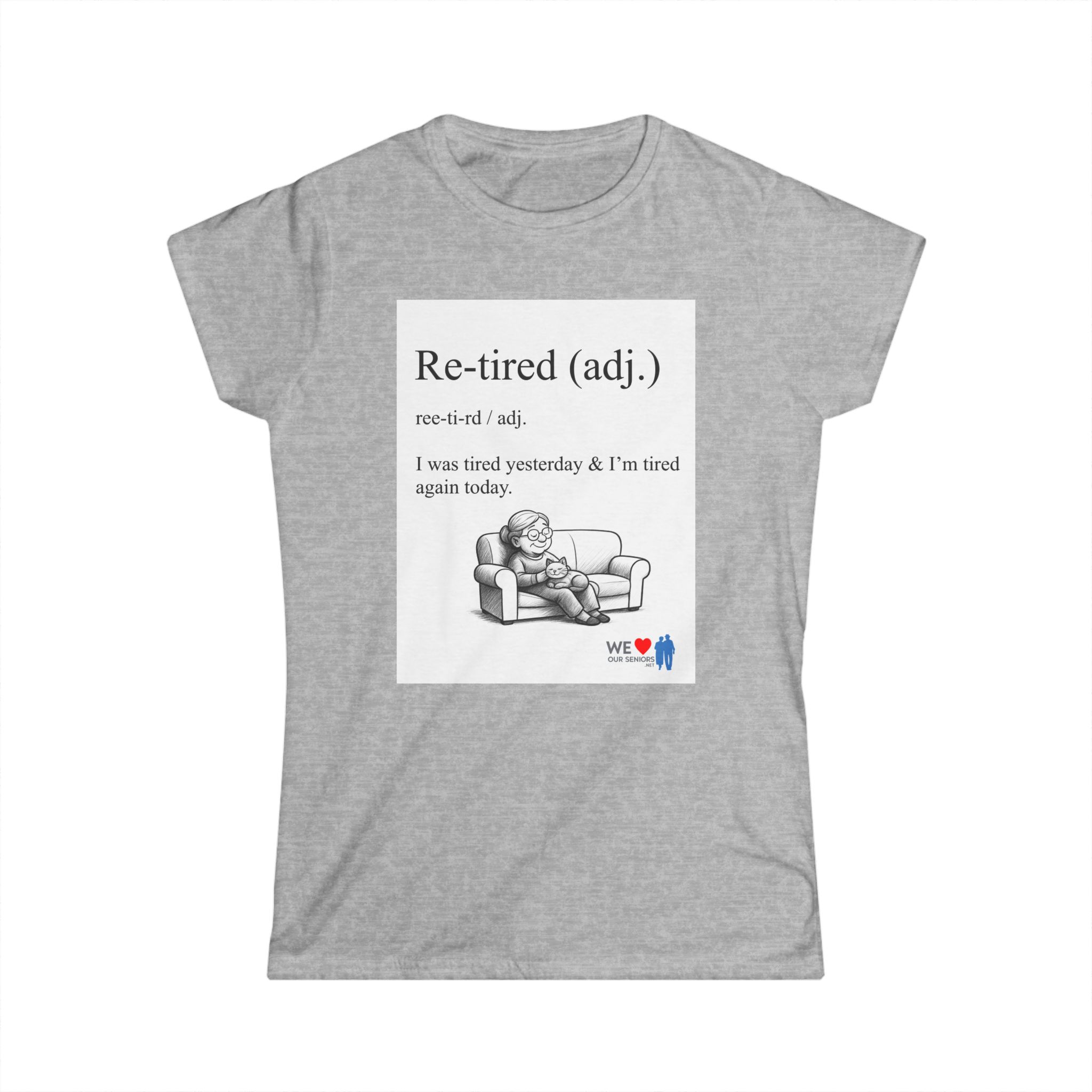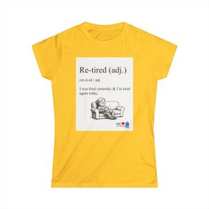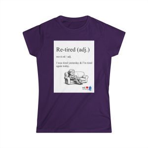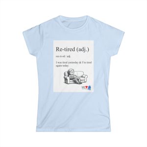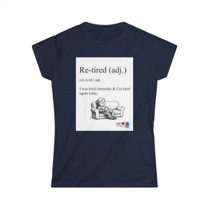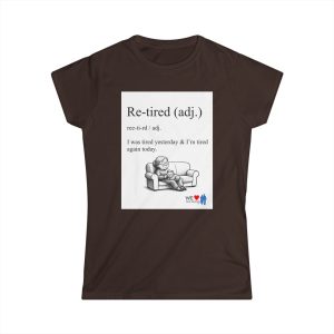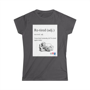 A lightweight women’s tee with a soft, lived-in feel and a wink of humor. The front shows a cheeky definition-style graphic — “Re-tired (adj.) I was tired yesterday & I’m tired again today.” — paired with a small illustration of a weary figure on a couch. The back carries a comic-strip style collage that adds personality and a playful narrative element. Semi-fitted and breathable, this shirt layers easily under jackets or stands on its own for casual days when comfort and a little levity matter. The tear-away label and durable double-stitched hems keep it comfortable and built to last. Runs true to size for uncomplicated sizing and everyday wear.